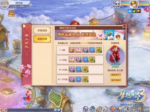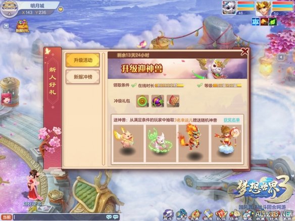 新服绽放前两周内,50级以上的少侠均可插足到“升级迎神兽”取得冲级礼包,并将正在这些少侠中随机抽取3名少侠赠送随机神兽。