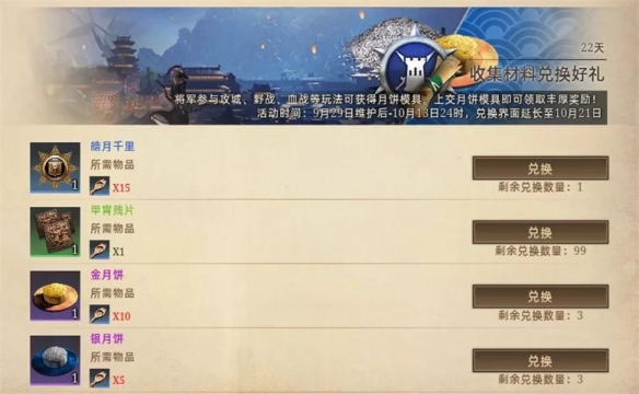 ◈ 五仁月饼:经典韵味的月饼,玩家食用后能够取得100战功、50点民众身手点、10000武将履历,助力将军晋升作战才气;