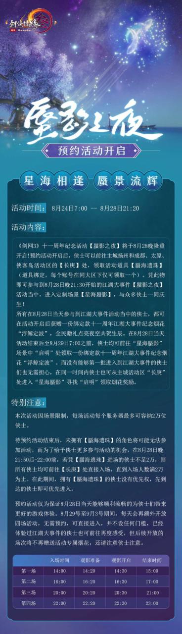 而正在8月29号至9月3号岁月,每天会再特别绽放四场行径,无需预定,可直接进入,并不设任何门槛,依然体验过江湖大事项的侠士也可赶赴再度感觉,但后续绽放的场次将不再赠送行径专属烟花,还请预防侠士预防。