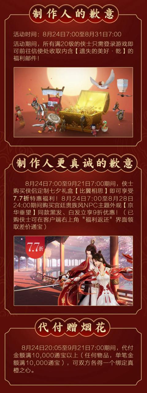 与此同时,七夕特惠福利今日也惊喜登场!8月24日7:00至9月21日7:00岁月,侠士置备侠侣定制七夕礼盒“比翼相思”即可享用7.7折特惠福利!正在此岁月,侠士举办任何商品代付,单笔金额满10,000通宝,两边即可各获取一个绑定款【线岁月侠士置备NPC中心外观“京华垂望”同款黑发、白首立享9折优惠!而依然置备的侠士将获取通宝差价返还,还请诸位侠士众众钟情。不单如许,8月24日7:00至8月31日7:00行径岁月侠士登录逛戏,即可赶赴信使处收取内含【丧失的美丽·乾】的福利邮件,同账号下一切大区一切脚色均可领取!