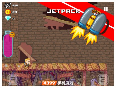 火箭兴办是包子感到最好用的兴办了,什么样的缺口都能轻松飞过,操纵形式也是点击右下角的B按键,能量栏用完,兴办就会隐没。