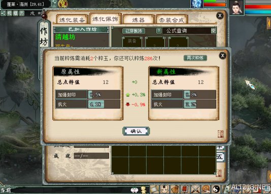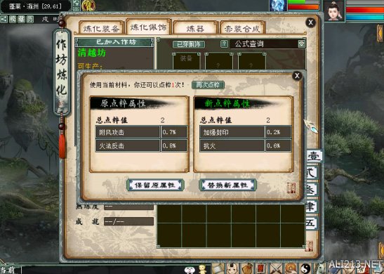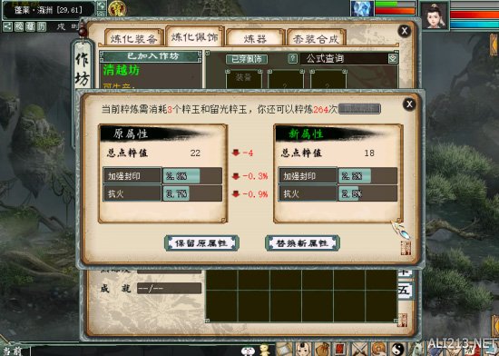 粹炼时,佩饰的总点粹值和单项属性点粹值正在之前基本上浮动,可以上升,可以低浸。粹炼分为两种形式,此中一种需泯灭粹玉、银两和体力,粹炼后会强制调换为新点粹属性;另一种形式须要泯灭粹玉、留光粹玉、银两和体力,粹炼后可正在新、旧点粹属性中自正在挑选。