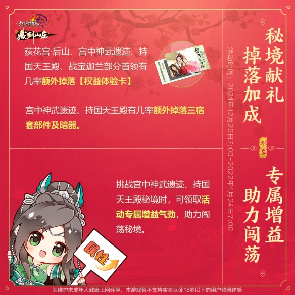 “权力体验卡掉落行动”惊喜延续!战宝迦兰、荻花宫后山的权力体验卡掉落将正在行动期内伸长,宫中神武事迹、持国天王殿也将扩大权力体验卡及异常设备掉落!宫中神武事迹、持国天王殿中更有诡秘人士前来声援,助力侠士克服首领,尽力备战荻花宫后山!