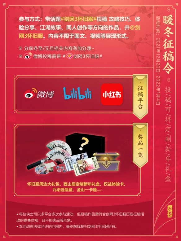 “暖冬征稿令”同步启动!正在微博、B站、小红书分享侠士的逛戏平居、江湖故事,即有机缘掉落西山居定制新年礼盒、权力体验卡、怀旧服周边大礼包等惊喜爱礼!