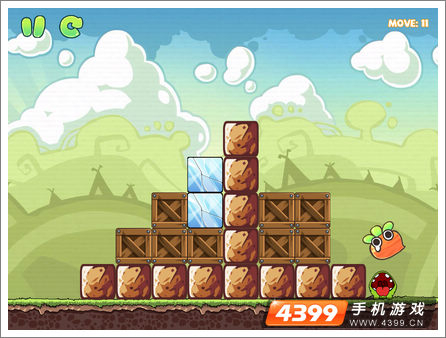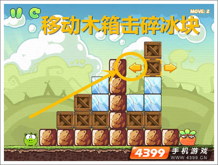 3.向左搬动另一侧的木箱,击碎冰块的同时搭修小猪落地的平台。