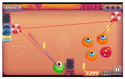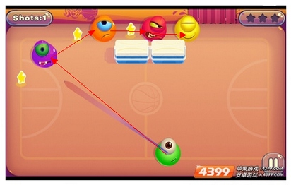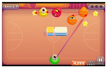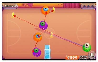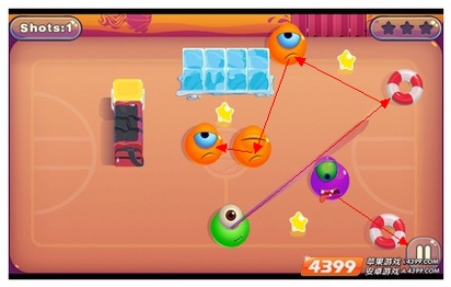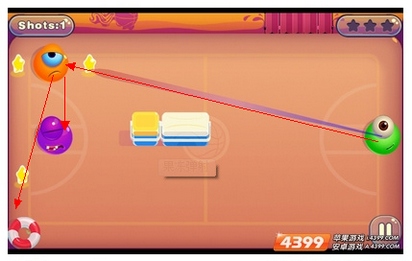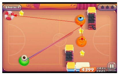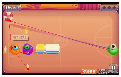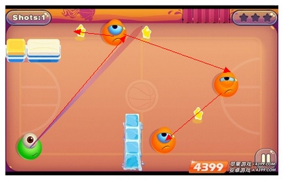 第十二合(这个合卡的难度正在于冰块旁的果冻,玩家击中中上场的橙色果冻后,会反弹到三分线上的)