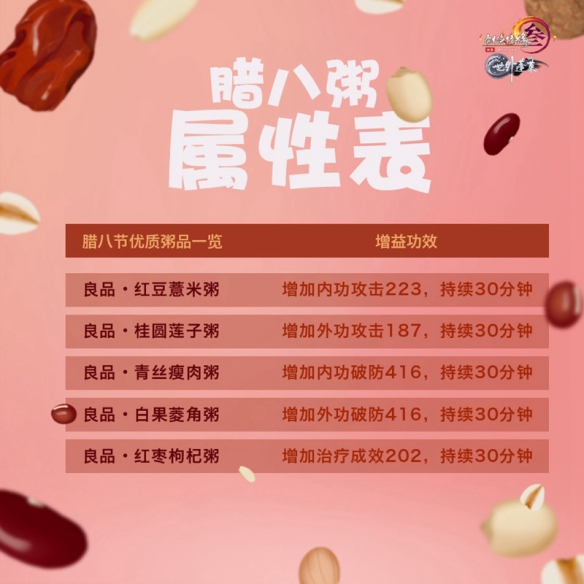 与此同时,侠士们熟练的腊八节运动与龙门绝境等福利机制正在本年也将不断与侠士们谋面,而跟着新赛季的开启,侠士们制制的腊八粥属性也将取得了大幅度的提拔,以此成家侠士们的能力。