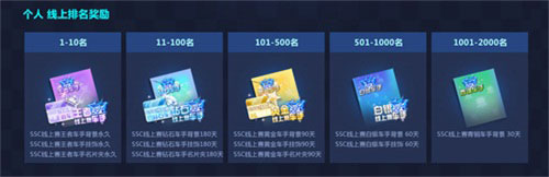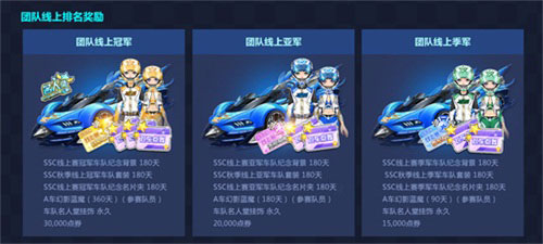 个体线名可能得到悠久SSC线上赛王者车手靠山、悠久SSC线上赛王者车手挂饰、悠久SSC线天SSC线天SSC线天SSC线上赛钻石车手手刺夹。线天SSC线上赛冠军车队庆祝靠山、180天SSC秋季赛线天SSC线上赛冠军车队庆祝手刺夹、360天A车幻影蓝魔、悠久车队名士堂挂饰以及3万点券。