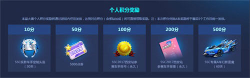 不管你的车技若何、效果若何,参预角逐都可能拿到丰富的奖赏。参预角逐并完毕1次对局,登录SSC页面举行签到即可获取对应奖赏,累计参赛1天即可得到500点券,累计2天得到1000点券、1000消费券,累计3天得到SSC非卖疾影车手定制拐杖(30天),累计4天得到SSC非卖疾影车手赛车服(30天),累计5天得到SSC西安站参赛挂饰(悠久)。同时逛戏内得到的角逐积分还可能参预免费抽奖,赢取极品豪礼!