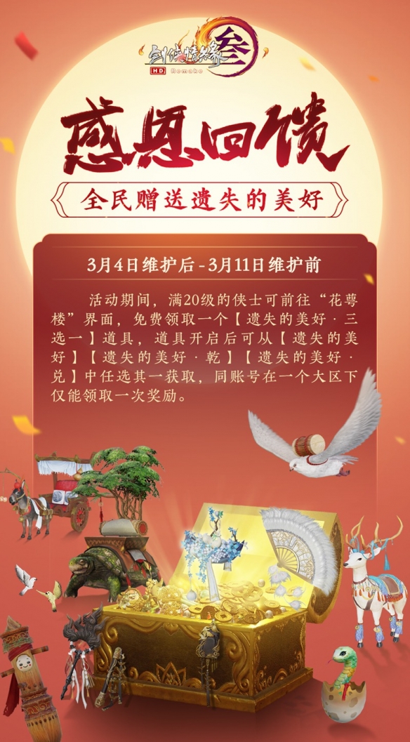 近期西山居旗下产物反复遭到犯罪分子的收集DDos攻击、效劳器入侵等犯罪手脚,正在此咱们发起诸位侠士批改短位暗号,绑定密保锁以晋升安宁等第,已绑定的侠士则无需忧虑!其它,为了答谢侠士们的明了与援手,《剑网3》为大师送上【丧失的美妙·三选一】感恩回馈!3月4日维持后至3月11日维持前,全盘满20级的侠士可赶赴运营行动界面“花萼楼”,免费领取一个【丧失的美妙·三选一】道具,道具开启后即可从【丧失的美妙】、【丧失的美妙·乾】、【丧失的美妙·兑】中任选其一获取,以感动侠士们的援手与爱好!资讯君正在此指导,同账号正在一个大区内仅能领取一次夸奖,还请侠士们众加把稳!