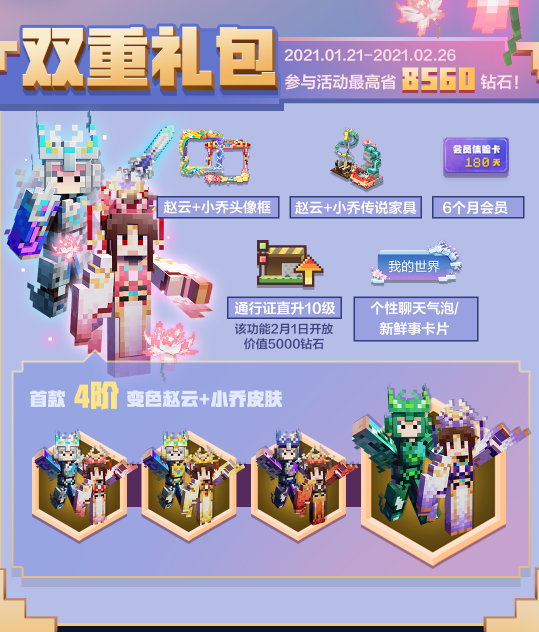 双重礼包:首款众重殊效4阶变色赵云及小乔皮肤、赵云及小乔头像框、赵云及小乔传说家具、6个月会员、通行证直升10级、闲谈及簇新事/一面核心卡片后台。