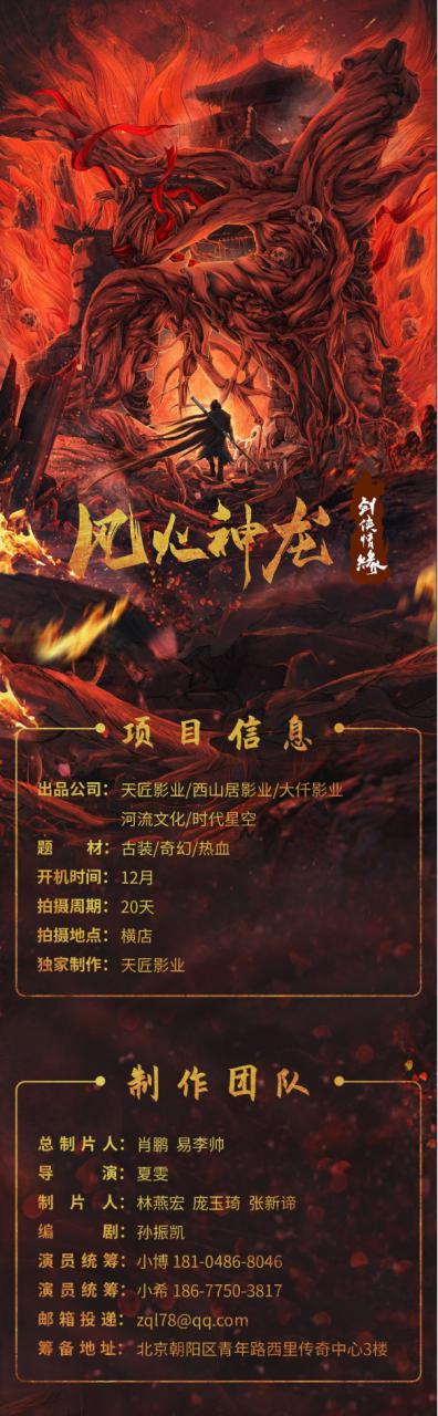 真人汇集片子《剑侠情缘之风火神龙》讲述了一个草根身世的丐助门生郭岩,无间思要成为为丐助争光的、大众口中的“大侠”,却正在经过一系列误解、欺辱、诱惑、悲观后,仍然选取站正在公道安正理的一边,最终剖析“侠义”的真义,成为人们口中“风火神龙”的故事。影片组讯消息仍然发表,盘算于2020年12月开机。
