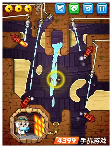 第三步:将中央的泥土开凿出来,让大波的水滂湃而下,顺势能够将中央的铃铛干掉,然后洪流就能够流进喜羊羊的喷水枪里,就能够成功通闭啦!