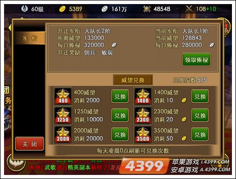 逛戏中还供给了威望兑换的方法,玩家只必要糟塌一局部的战功和逛戏币就能获得相对应数目的威望。玩家每天能够实行5次的威望兑换,每天0点会革新兑换次数。
