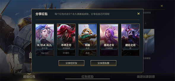 进入工作界面后会看到有三个界面,折柳是超等红包、红包赏赐和端逛戏家反应。超等红包能够分享给己方的五位知交,让你的知交襄助点击,点击后知交则能够获取皮肤或者好汉赏赐。当你同时分享给五个知交之后,你就能够看到你的五位知交获取的皮肤了。