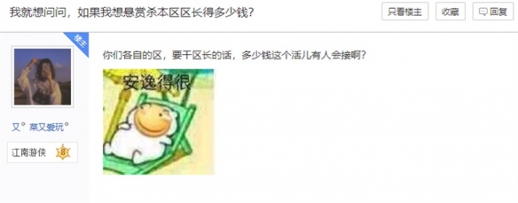 更有玩家看旺盛不嫌事大,借机议论起了各大办事器区长的赏格身价,并祈望大伙众筹,给己方不断看重的区长一次爱的一击。