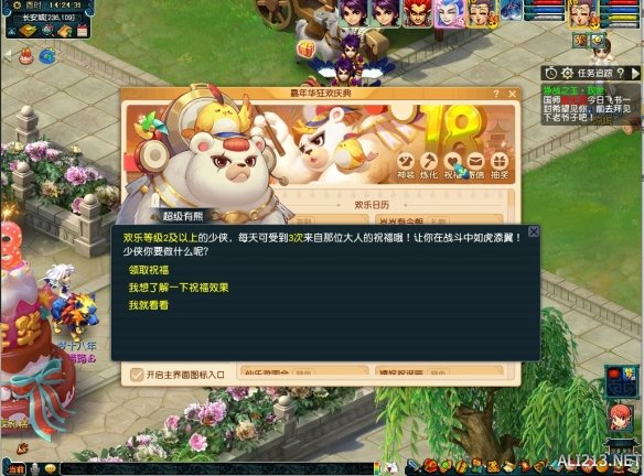 盛世佳节到临之际,公共可与三界天命门派的高足共赴嘉岁月盛筵。正在“超等有熊”处,公共可讯问这些高足的处所,通过与他们打宽待或闲聊等格式加深相互之间的热情。当公共和少许门派高足的好感度完成满级后,可获取他们的回礼。而正在三界书院当中,书院院长也介入到了嘉岁月庆典当中,解答准确院长不依时正在编制频道颁布的题目,即有机遇获取各式惊喜表彰以及院长赠送的“嘉岁月贺卡”。
