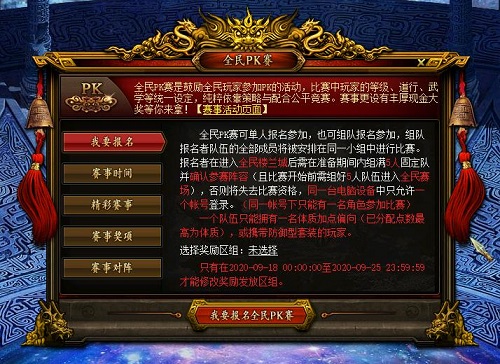 9月18日至9月25日时期,整个等第大于10级的玩家均可赶赴天墉城“全民PK赛接引人”处举办报名。报名体例分为两种,一是组队报名,二是一面报名。如玩家采取组队报名,编制会将整个步队成员传送到统一线途举办报名确认,整个队员采取确认后才算报名胜利。如玩家采取一面报名,将会被编制随机传送到一条线途,玩家必要正在竞赛出手前构成5人步队,并确认参赛步队。