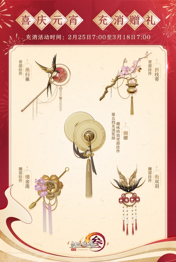 庆佳节怎能少得了积分回馈呢?2月25日7:00至3月1日7:00功夫,侠士参加充消即可尊享2倍积分回馈。不但如斯,新一批的充消回馈奖赏也正在今日登场!2月25日7:00至3月18日7:00功夫,侠士参加充消举止,可按照充消金额得回精巧腰部挂件“缀金莲”、背部挂件“折枝寄”、腰部挂件“衔双羽”、背部挂件“燕归巢”,以登科五档充消奖赏·兴味殊效背部挂件“铜镲”!