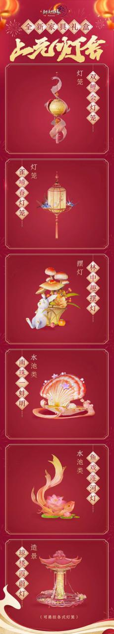家具礼盒·上元灯会(内含摆灯·林中趣摆灯、灯笼·双鲤会灯笼、灯笼·雀啼春灯笼、水池类·南珠一蚌明、水池类·鱼戏莲河灯、制景·琼楼霞蔚灯各一个):2月25日7:00至3月25日7:00上架,售价13,770通宝。2月25日7:00至3月4日7:00首周限时8折,折后价11,016通宝,为不绑定款。3月4日7:00至3月25日7:00还原原价,为拾取绑定款。可代付,弗成用积分兑换。