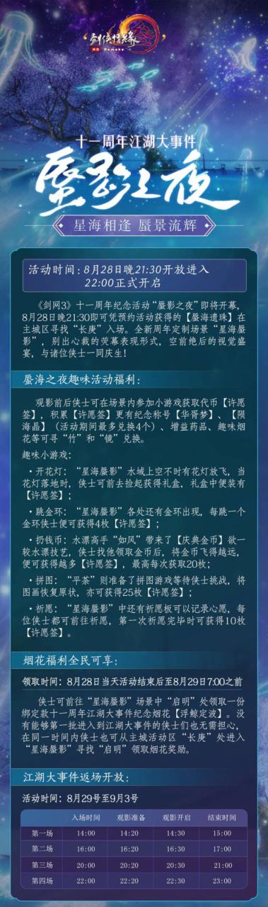 当然还请侠士们不要忘却,正在今晚十一周年线上直播揭晓会盛典已毕后,《剑网3》端逛内还将开启十一周年江湖大变乱营谋“蜃影之夜”!参预营谋无需任何门槛,8月28日(即今晚)21:20之前,赶赴主城营谋区寻找NPC“长庚”实行预定即可领取专属道具【蜃海遗珠】,依赖此物便可进入今晚21:30后正式开启的定制场景“星海蜃影”中静待江湖大变乱开启。不光有空前绝后的视觉盛宴,还将有诸众风趣小逛戏以供侠士玩耍,更可得回营谋专属道具【许愿签】,用以赶赴NPC“镜”和“竹”处兑换回忆称呼【华胥梦】、增益药品、风趣烟花以及最众4个【陨海晶】!而正在当晚营谋已毕后至8月29日7:00前,侠士均可赶赴“星海蜃影”场景中“启明”处领取一份绑定款十一周年江湖大变乱回忆烟花【浮鲸定波】。没有也许第一批进入到江湖大变乱的侠士们也无需操心,正在同临时间内侠士也可从主城营谋区“长庚”处进入“星海蜃影”寻找“启明”领取烟花夸奖。