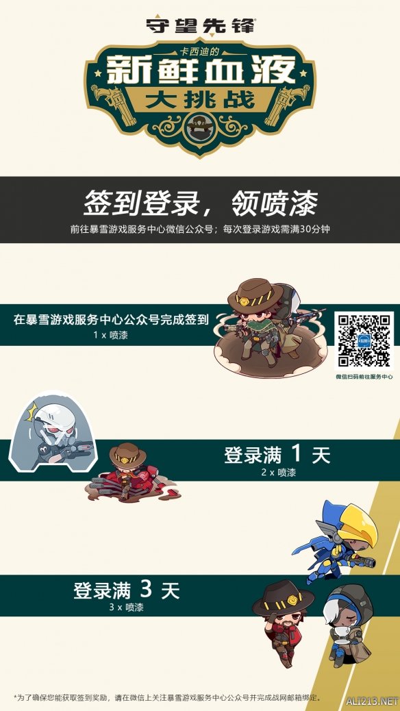行径时代,扫描二维码赶赴暴雪逛戏效劳核心群众号眷注群众号并举行行径“签到”,或正在暴雪逛戏效劳号内恢复“守望喷漆”并举行行径“签到”。