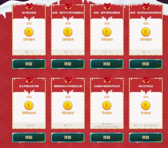 12月25日维持后至2021年1月28日,诸君玩家完结诸如逐日登录逛戏、得到一场军团排位赛得胜等通常职责,即可前去行径页面领取对应的圣诞币。