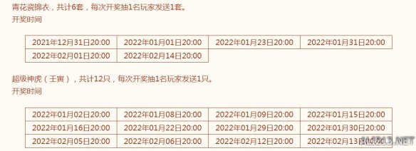 正在本次行径中,梦幻西逛共为民众绸缪了6套青花瓷锦衣以及12只新年神兽超等神虎(壬寅)。每次开奖年华到来时,梦幻西逛都邑为1名中奖玩家送出1套青花瓷锦衣或1只新年神兽超等神虎(壬寅)。共计会正在行径时间开奖18次。只消民众介入个中并竣事本次行径的逐日职业,那么就更有恐怕成为侥幸玩家,将这些有数大礼收入囊中。
