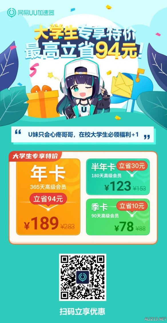 只必要扫描下图中二维码即可插足举止,依照举止页面领导举办学生身份认证,认证凯旋后,就能够享福这个专属优惠举止。本次举止采办季卡能够享福立省10元的优惠,采办半年卡则能够享福立省30元的优惠,而采办年卡能够享福到立省94元的强大优惠,均匀每天只需0.53元。