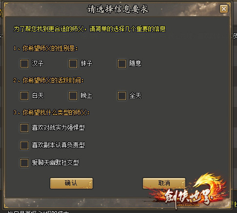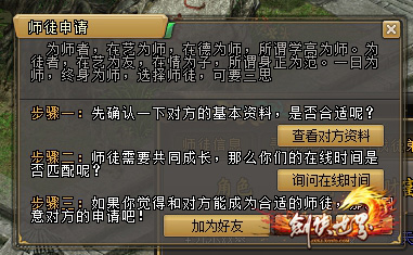 对付崭露头角的江湖新秀们来说,找到一个好的师父无异于交到第一个知己。何如才具寻找到适合本身的良师益友呢?《剑侠宇宙》记实你的新闻央求,无论是性别、活动年华仍旧类型都按你的央求筛选,精准化立室。当然倘使你是腼腆的江湖小虾,也能够立案新闻,静静守候师父来把你“捡走”~