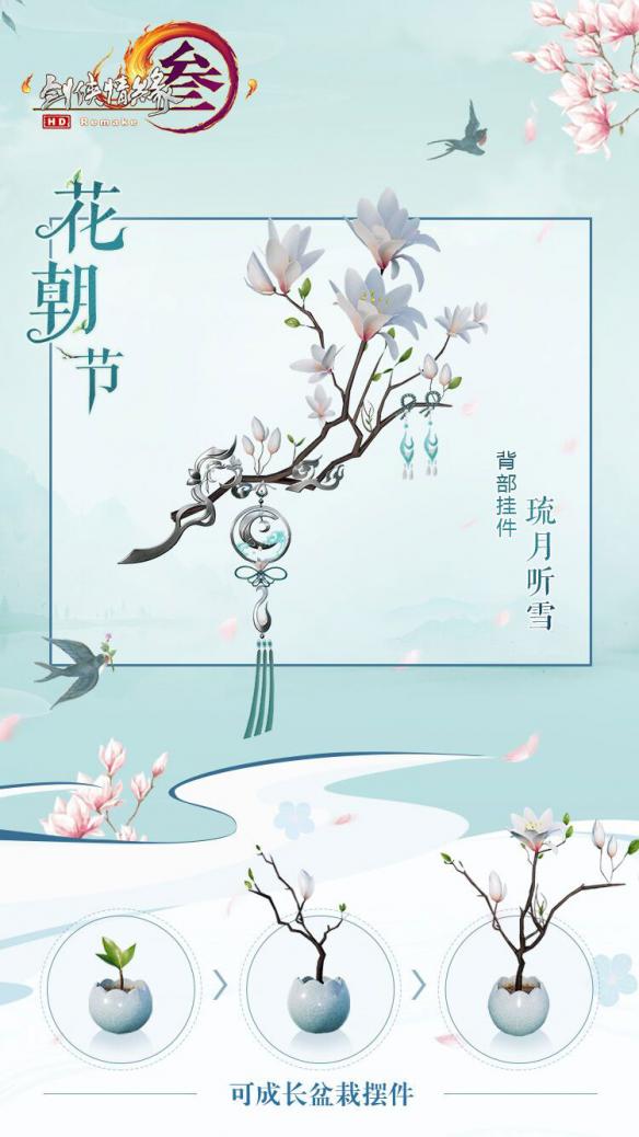 行动奖赏:2018年花朝节挂件【琉月听雪】、殊效道具【琉月听雪果实】、【可发展盆栽】、【月季花】、【清潇梨歌】、【小刺】、【长映红颜】