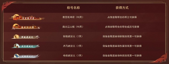 剑指金陵渡死战终了后,还将凭据死战中的赢输及临场呈现发放称谓:内外乾坤君、称谓:南北山河:等限制称谓赞美。