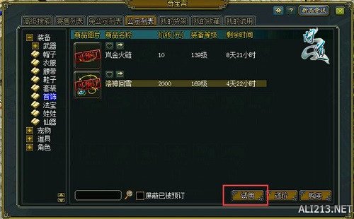 不但如斯,玩家还可能点击界面中的试用按钮,此商品增加到奇宝斋的试用界面中。正在该页面道友可能查看或删除目前已试用的商品。试用办法为,玩家进入逛戏的九重天区组区组中,与NPC“九重天仙官”疏导并缴纳200,000文钱,即可领取该试用商品60分钟。为轻易体验,正在九重天试用的商品会添补寿命、诚实度、灵气、耐久度、风灵丸,装置的加点属性恳求会降至1点。