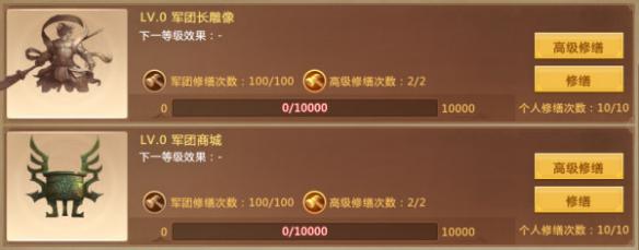 所有军团成员都可以使用修缮石料来对建筑进行修缮,以增加建筑的建造度,如果是军团长或者副军团长,还可以消耗军团资源对建筑进行高级修缮,可以增长大量建造度!