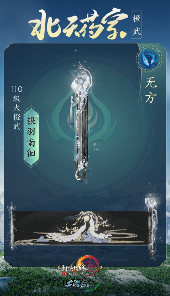 “无方”心法110级大橙武——银羽南徊,轴长一尺八寸,合重六斤一两。药宗灭门后,秦素问被温蘅带回东海,初至东海时秦素问刚刚经历灭门之痛,随身所带的百草卷与毕生整理的心得笔记亦在动乱中付之一炬,同时失去宗门、家人与毕生心血的秦素问不知何去何从,终日意志消沉。一日秦素问在集市上见到异国商人带来的白羽异鸟,从未见过南国风物的他得知此鸟名唤孔雀,来自遥远的天竺,想到自己亦是千里之外漂泊至此,一时心中大恸,呕血数升,卧床不起。温蘅与方乾得知后前往秦素问住处为其治疗,方乾与之相谈一夜,无人知其所谈何事,只知此夜过后方乾命墨宗助其重制百草卷,绘孔雀尾羽于其上,秦素问携此卷进入九天书库研读医典,继续自己在药宗时未完成的研究。药宗重建后,此卷亦随秦素问重回长白山。