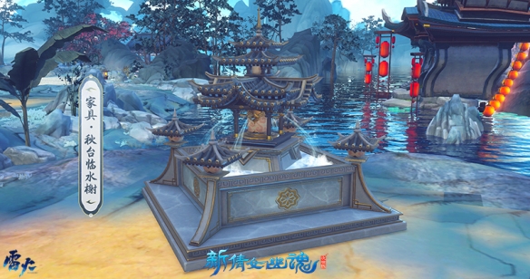 本次琼楼雅舍系列家具为全新设计,并提升了材质纹理及相关特效,使得家具的视觉观赏性更佳。两面华扇屏风立于雕木坐席后侧,几盏月灯悬挂于银白色古树上,轻撒下点点光华。少侠可邀上三五好友,于这绚丽的树下弈棋赏景,安宁又静谧。