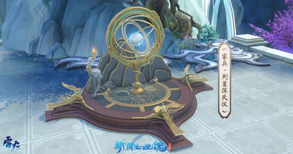 三只神鸟分别伏在在三个方向,台中衔着火焰的仙鹤与几只小巧的金雀环绕着中心的浑天仪,光球于中悬浮而动。