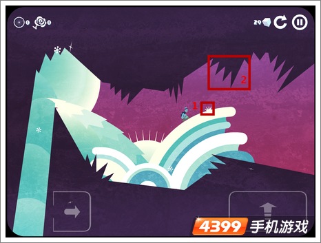 3.到达图片处的时候,玩家们要注意倒刺,跳跃过去,图示处1的倒刺和图示2处的倒刺里的比较近,玩家点击跳跃键后要点击退后的按键才能避过图示2的倒刺哦。