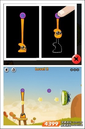 2、你再将它的另一只手扯出来连接到另一个圆球上,跟第一关一样,外星人在中间用手臂连接着两头的小球;操作原理跟第一关就没差别啦,也是摆钟原理,切断一边的手臂,使它左右摇摆!它会经过两个星然后进入UFO,第二关就这样过啦,也不是也很简单吧?