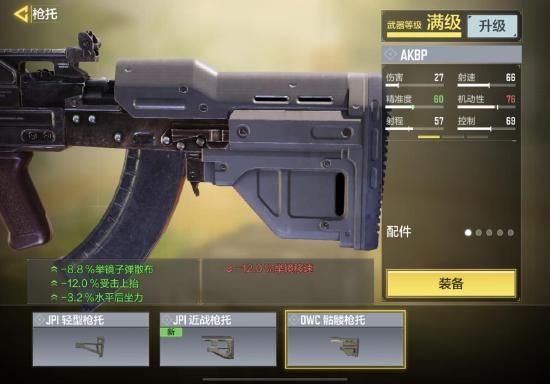 枪托我们选择OWC骷髅枪托,减少百分之8.8的举镜子弹散布,减少百分之12的受击上抬,和减少百分之3.2的水平后坐力,因为AKBP这把枪的裸枪后坐力还是特别大的,所以我们需要OWC骷髅枪托来提升他的稳定性,和减少受击上抬,让我们对枪的时候更稳,胜率更高,