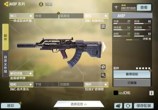 被动技能我们在爆破的模式下我还是推荐大家使命金属背甲弹,很多墙体都是可以进行穿点,据点和热点模式,我们可以选择自己的喜欢的配件来进行搭配,因为我们在打据点和热点模式的时候还是很少有时间和机会去穿点,镭射方面我们依旧选择性价比之王,OWC战术激光,来加快他的开镜时间,和子弹的散布,弹夹我们选择,50发的扩容弹夹,搭配50发的扩容弹夹,简直就是一把小机枪,不管是冲锋陷阵,还是架枪,都不用担心子弹不够啦!