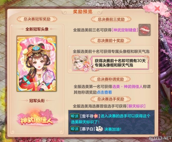 《神武4》电脑版全服选美大会总决赛也将于7月11日22:00正式落下帷幕,届时将会为总决赛冠军发放专有头衔和成就勋章“神武俏佳人”,除以往称谓奖励外,本次人气前三名将额外获得“神武十周年定制键盘”、前十名将额外获得选美专属聊天气泡和头像框。