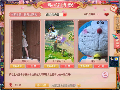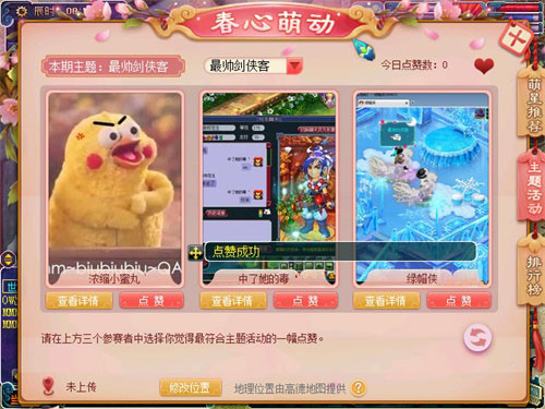 为了能够让每一个参赛玩家可以根据自己所长,全方位展示自己的才艺。本届春心萌动大赛为玩家设置了六大主题,分别是:最帅剑侠客、天女魃、神兽临门、财源滚滚、最萌骨精灵以及净世煌火。