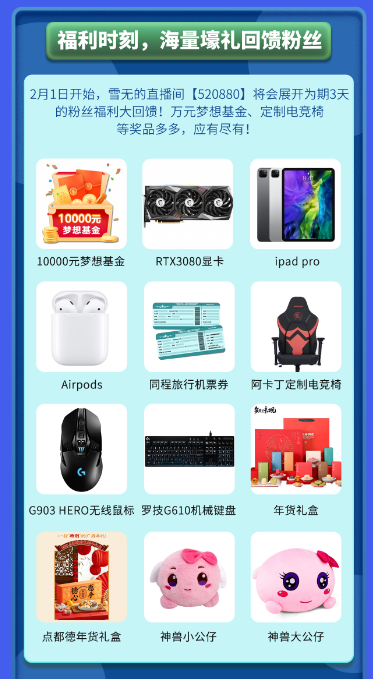说好是回馈粉丝福利活动,本次的豪礼可不是说说而已!除了有心愿积分、罗技G610机械键盘、罗技G903 HERO无线鼠标、点都德年货礼盒、RTX3080显卡、iPad Pro、Airpods、3000元购物基金、666现金红包、游戏锦衣等豪华奖励,雪无还特意联合阿卡丁与同程机票为广大粉丝朋友们争取到了雪无定制电竞椅和1000张机票优惠券!还有万元梦想基金等你来拿,这样的福利力度,试问游戏主播里谁出其右?