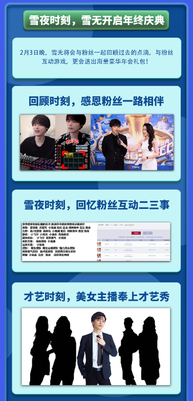 之前看过雪无直播化妆的粉丝们应该都会对他的隐藏娱乐属性有点了解,这次的年度庆典中雪无还特地邀请了几位知名的娱乐主播在线连麦进行才艺solo,到底会有什么样的精彩演出准备亮瞎观众们的眼球?Airpods、罗技G903 HERO无线现金红包、游戏锦衣、年货礼盒等弹幕抽奖奖励又将花落谁家?敬请期待!