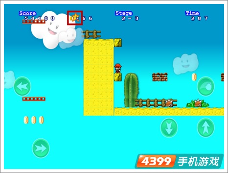 3.星星:星星(如图示处)是无敌道具,当马里奥吃了以后碰到什么东西都不会死,但是时间是有限的,时间到了道具会消失。
