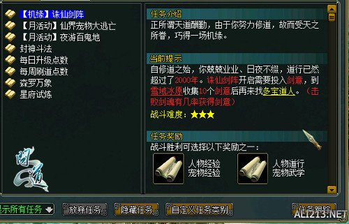 诛仙剑阵就是一个道行机缘系统,当玩家的等级大于60,角色道行达到一定绝对值就能够触发此机缘任务。玩家们可以通过天墉城的仙缘道人和蓬莱岛的多宝道人,进入到诛仙剑阵中修行,在剑阵中成功挑战诛仙剑意、戮仙剑意、绝仙剑意、陷仙剑意就可以获得数值奖励,每人每天最多进行一次剑阵修炼。