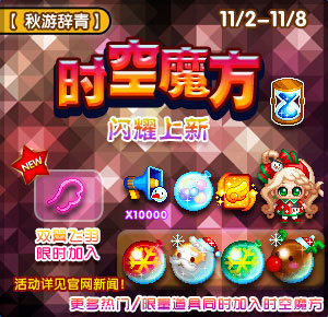 深秋时节,时空魔方再次降临,打开了异次元空间。全新极品双翼飞羽加入到本次魔方中,变幻的色彩让你成为瞩目的焦点~同时全频雪宝喇叭10000个限时免费登陆时空魔方,刷到就是赚到,还有:宠物天使3转卡、月野兔小雪人装、雪夜圣诞泡泡、彩虹琥珀泡泡,等你来!更多热门、限量、GM推荐道具一同加入时空魔方,一起刷不停!