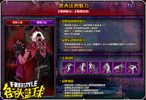 华丽变身!新版本中添加了路西法的自动觉醒功能,在创建路西法时还能额外选择一种能力,击飞对手的概率增加2%或者摔倒概率减少2%,觉醒后所有专用动作都附带特效!与天使安杰拉一样,比赛1分钟后点击T键变成觉醒状态,维持1分钟,离下次觉醒需要1分钟的准备时间,觉醒以及解除状态在攻守交换时适用!