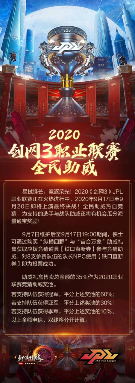 除了全新资料片预热活动即将来袭外,2020《剑网3》JPL职业联赛也在火热进行中,9月17日至20日正是巅峰决战时刻!侠士们熟悉的全民助威活动也将正式开启,9月7日7:00至9月17日19:00期间,侠士即可通过购买“纵横四野”与“宙合万象”助威礼盒获取应援竞猜道具【铁口直断券】,前往主城擂台区对8支参赛队伍的队长进行投票即可成功参与助威竞猜,若所支持的队伍获得前三名的好成绩,参与竞猜的侠士将有机会瓜分海量通宝奖励!还等什么?赶快为你支持的选手与战队应援助威吧!